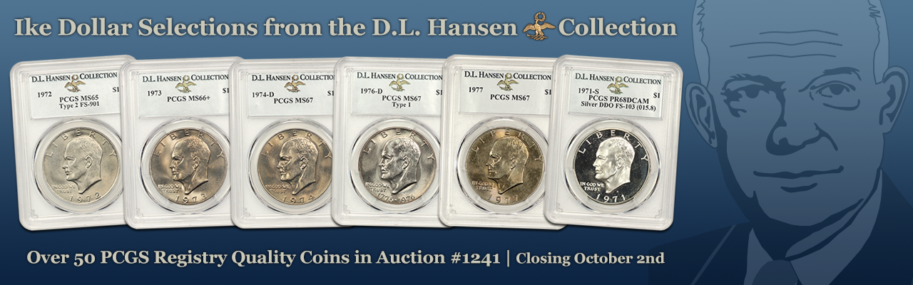 I bring this up now as we begin to auction several fresh groups of items that we recently received from the Hansen Collection in our weekly Sunday Auctions. The next approximately 8 auctions will feature a select series from the Hansen Vault. This week, for example, we have 50+ coins in Auction 1241 from the Eisenhower Dollar Series including a 1976-D $1 PCGS MS67 (Type 1). The majority of these are graded MS66 and above and a perfect opportunity to upgrade or fill in missing dates to your Ike registry collection.