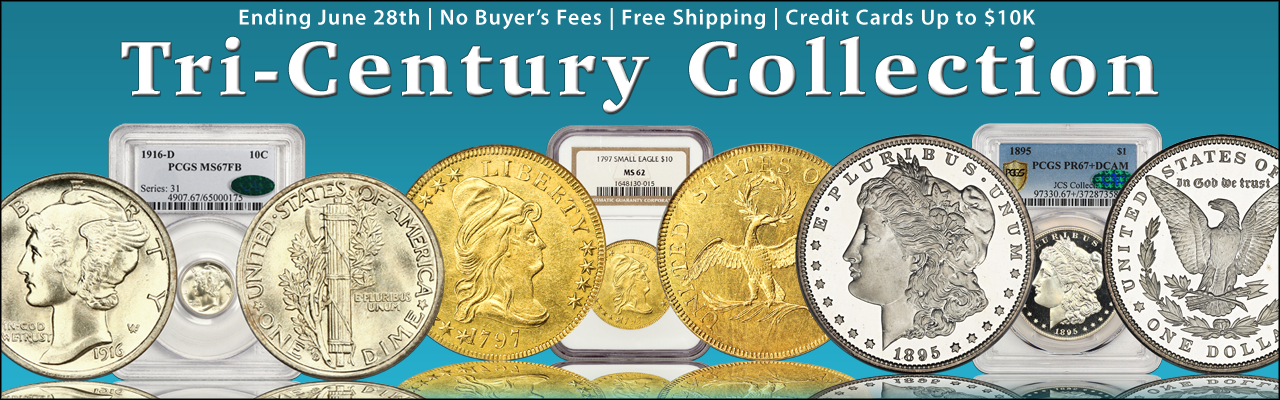 This Sunday evening we’re offering the Falls Church Collection, which primarily contains a vast selection of early half cents, both circulation strikes and low mintage proofs. It’s quite a dazzling array of coins that have been put away for years and are just now seeing the light of day! The coins that are housed in new holders are pieces that we actually submitted for the consignor as raw items and it was quite a treat to handle these pieces in their natural form. We expect to see a lot of action this weekend as these lots come to a close! Following this impressive showcase is our Tri-Century Collection which we’ll talk about in more detail next week.