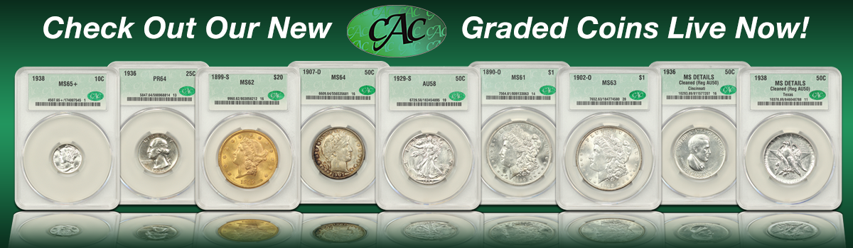 We recently received a large shipment back from CACG, so you can expect to see 20-30 freshly-graded CACG coins in each of our weekly online auctions. We have everything from Lincoln Cents and Morgan Dollars to Barber Dimes and Commems. There will be something for everyone in our CACG offerings in the upcoming weeks!