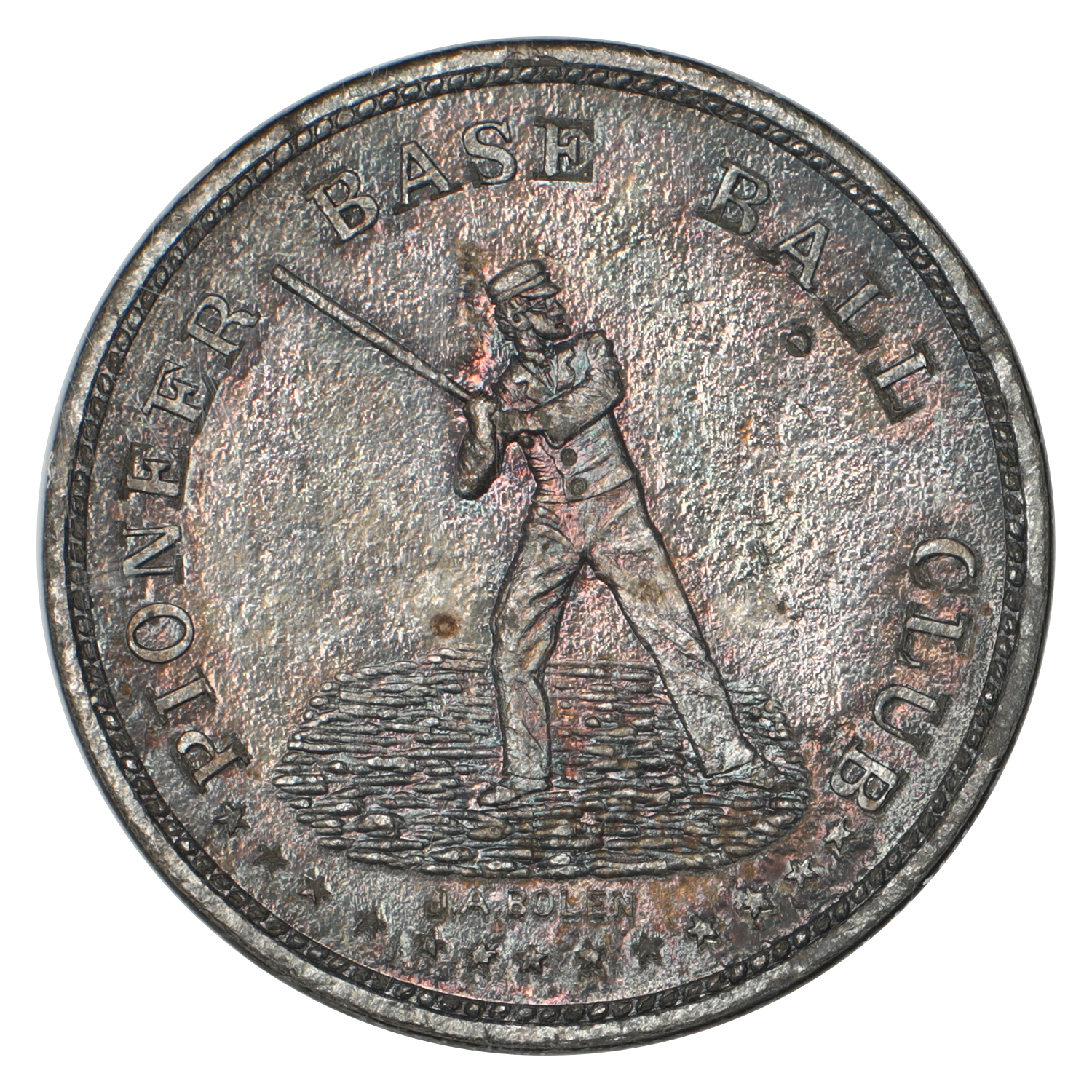The obverse of the medal displays a baseball player, at bat and dressed in rather tattered clothing and a cap, with a baseball flying toward him. The initials of John Adams Bolen are present below. Underneath the signature of Mr. Bolen, 13 stars are present, representing the first 13 Colonies of America, possibly put there to resemble the 13 stars present on most United States-issued coinage at the time. The legend around the rims reads “PIONEER BASE BALL CLUB."