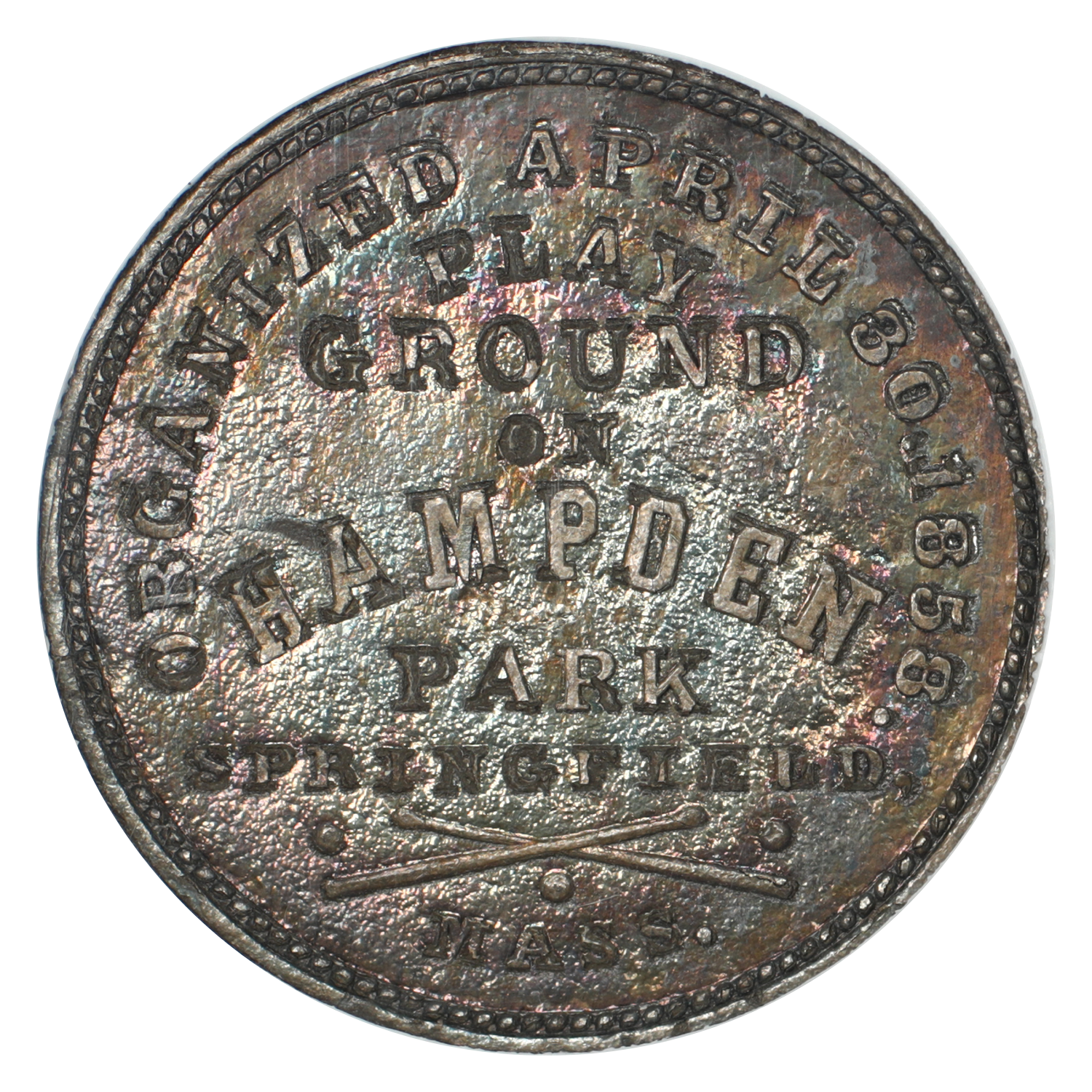 The reverse of the medal is a more simplistic design with the top legend reading “ORGANIZED APRIL 30.1858.” Towards the center of the coin, the other legend reads “PLAY GROUND ON HAMDEN PARK SPRINGFIELD," which was a field used for multiple sporting events, such as bicycle competitions, as well as a neutral site for college sporting events. The park was also known as Pynchon Park or League Park and is most famously known for being used for recreational baseball games as well as early professional games. It was here in 1869 that the Cincinnati Red Stockings, now known as the Atlanta Braves, played against the Springfield Mutuals, where Cincinnati won 80-5 during the season of their 65-0 record. Later on, this park was used as a place for multiple minor league teams and the field moved several times. Back to the medal at hand, a design can be seen of 2 baseball bats lying down intersecting and 3 baseballs surrounding it. Lastly, a legend reads "MASS", short for the state of Massachusetts.
