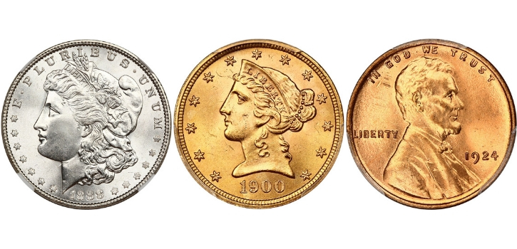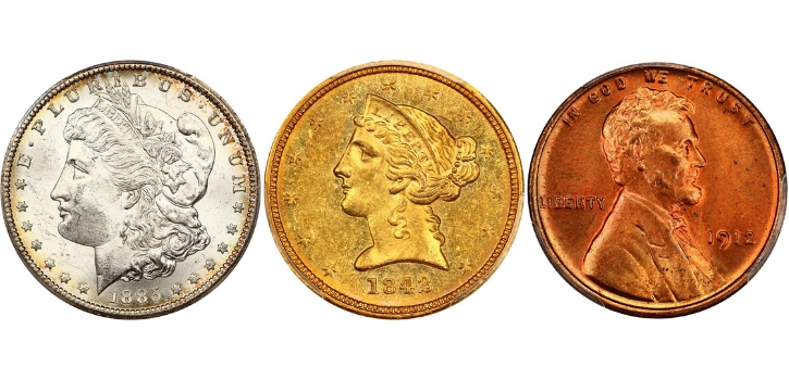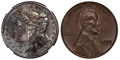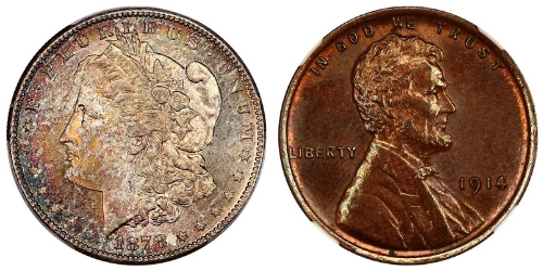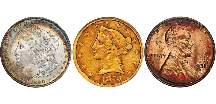 Our "color rating" or degree of toning on coin listings refers to the overall amount of toning on a coin with respect to its original look at minting. We use a scale of one to five for all denominations and series. Below is an explanation of each rating and a silver, gold, and copper example.