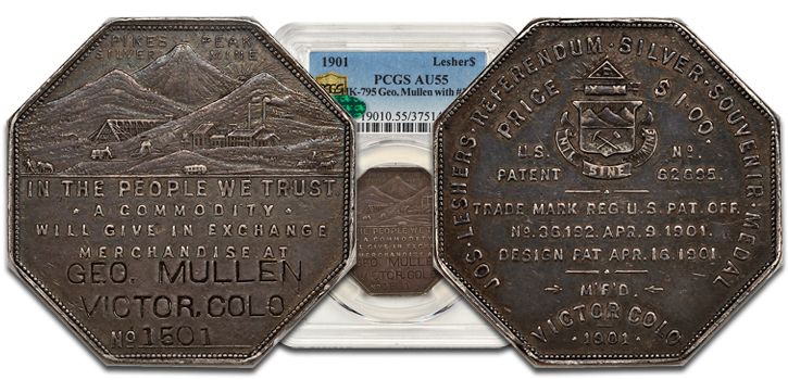 Another particularly exciting piece is stamped by George Mullen, a shoemaker in Victor, Colorado. It’s believed that 50 examples of these were struck, but only 24 have been located in the Lesher Dollar census. The piece we’re offering is a lovely AU with gentle blue and green highlights: