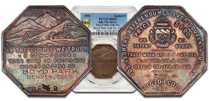 With a dormant mine on his hands, Lesher became interested in the possibility of minting coins for local use. By 1900, he had successfully set up a private mint and began to produce octagonal dollars. They weighed one troy ounce of .950 silver, with a stated face value of $1.25. This was significantly above the actual passing rate of silver, which was 65 cents per ounce at the time. In 1901 he reduced the size slightly to the same weight as a standard silver dollar and lowered the face value to $1.00.