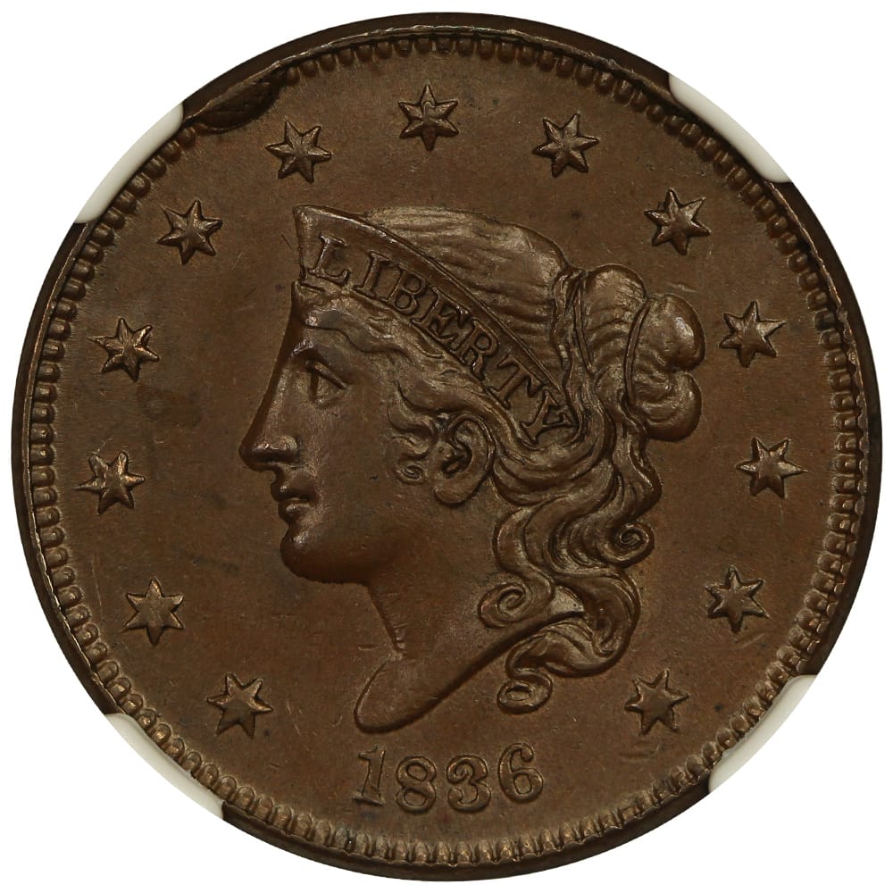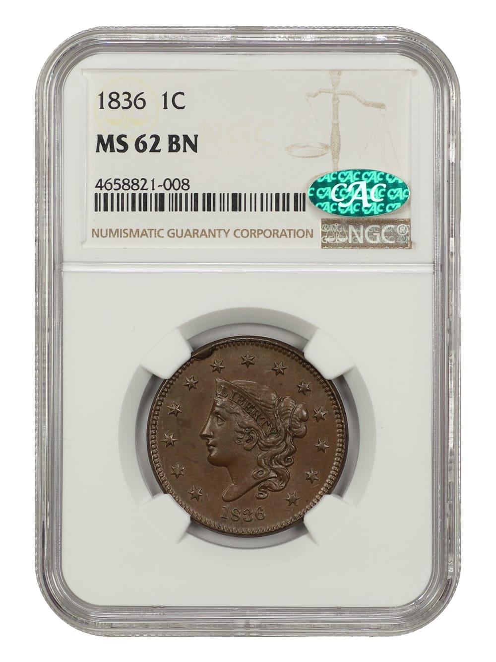 1. 1836 1c NGC/CAC MS62BN